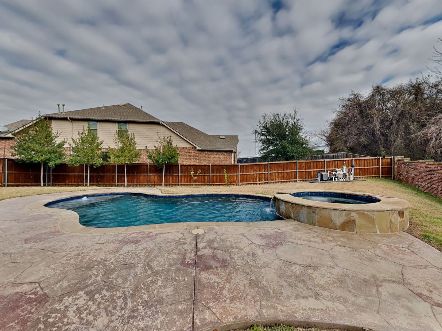 Experience luxurious living in a gated community backing to a picturesque golf course. This beautiful brick two-story home offers 4 bedrooms, 3 full bathrooms, and a 2-car garage, blending elegance with everyday convenience. Step into a private backyard oasis featuring a heated Gunite pool and spa, perfect for year-round enjoyment, along with a covered patio ideal for outdoor dining and entertaining. Inside, the oversized kitchen is a dream for culinary enthusiasts, showcasing granite countertops, a large island, stainless steel appliances, gas cooktop, walk-in pantry, built-in desk area, and an abundance of cabinet and counter space.